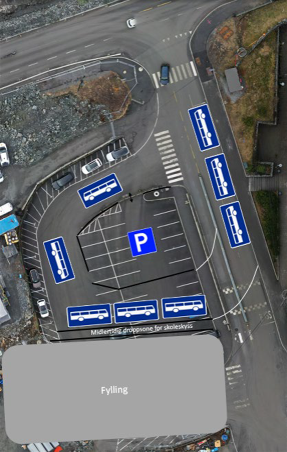 Frå 28. mai 2024 vert køyremønsteret ved Søre myrane endra, grunna etablering av fylling for ny veg og dropp sone til ungdomskulen. Dagens veg vert flytta ca 15-20 meter opp i bakken ved søre myrane. Køyremønsteret vert uendra, men dette får konsekvens for parkeringsplassane. Det vil bli merka for av og påstigning ved bussoppstilling som vist i skisse. Arbeidet vil bli utført 27-28. mai.