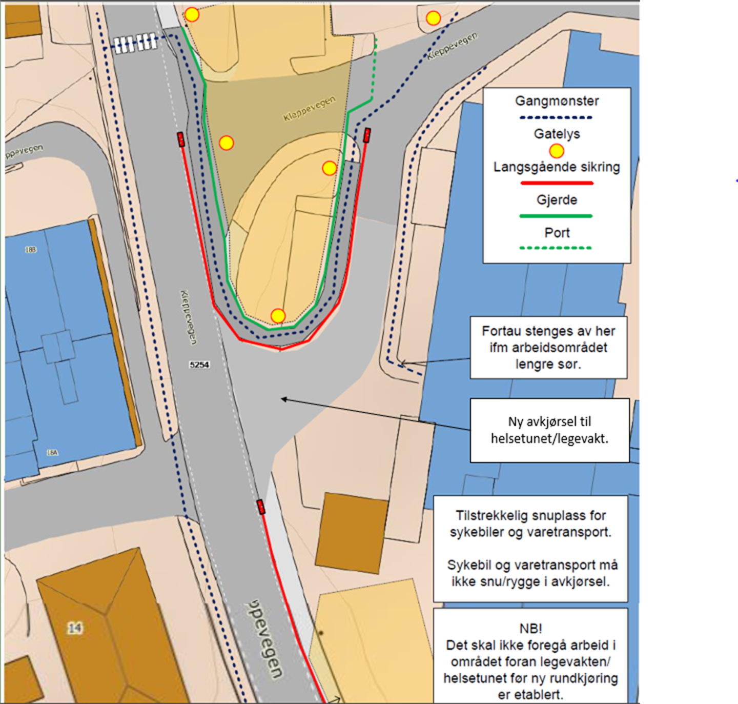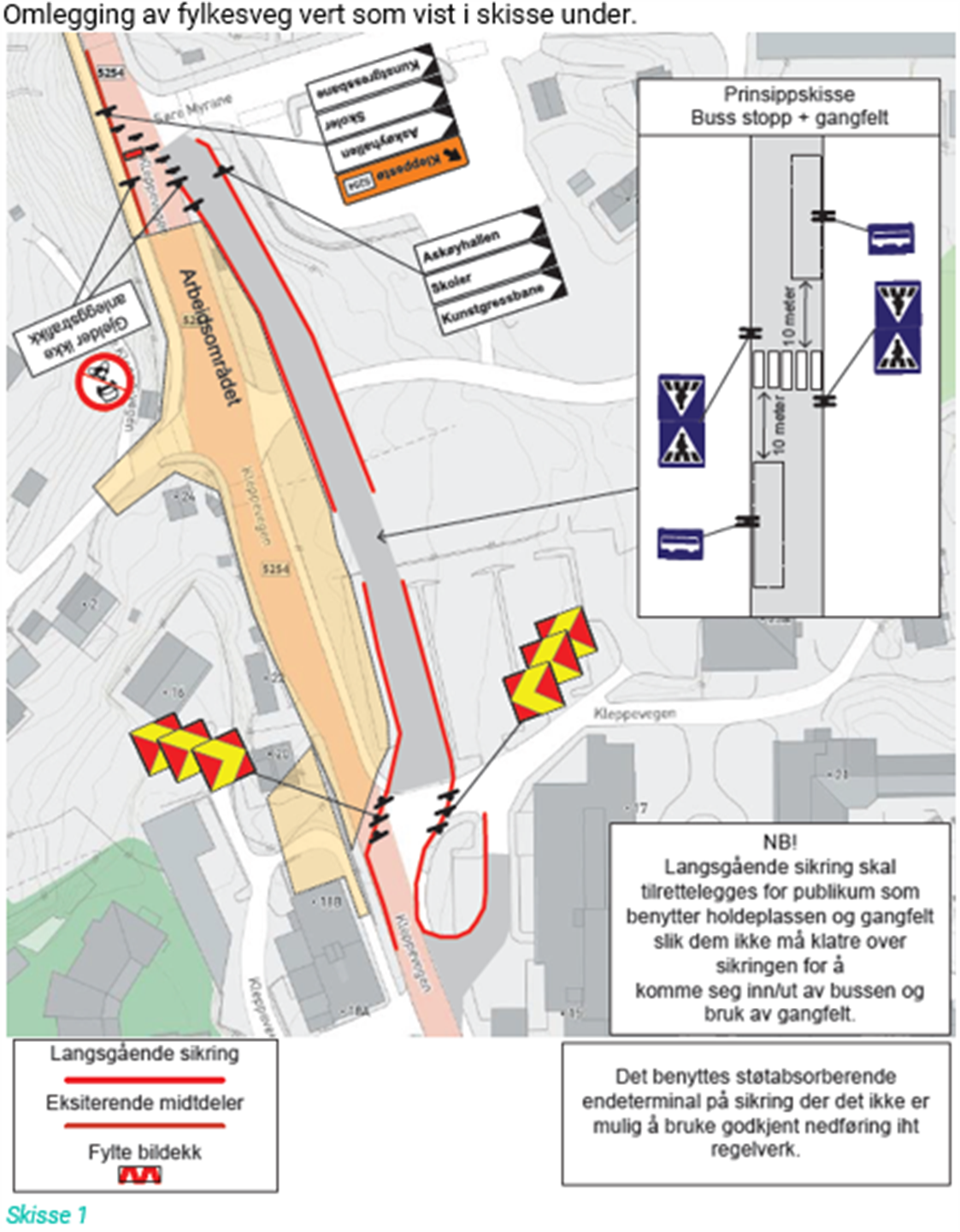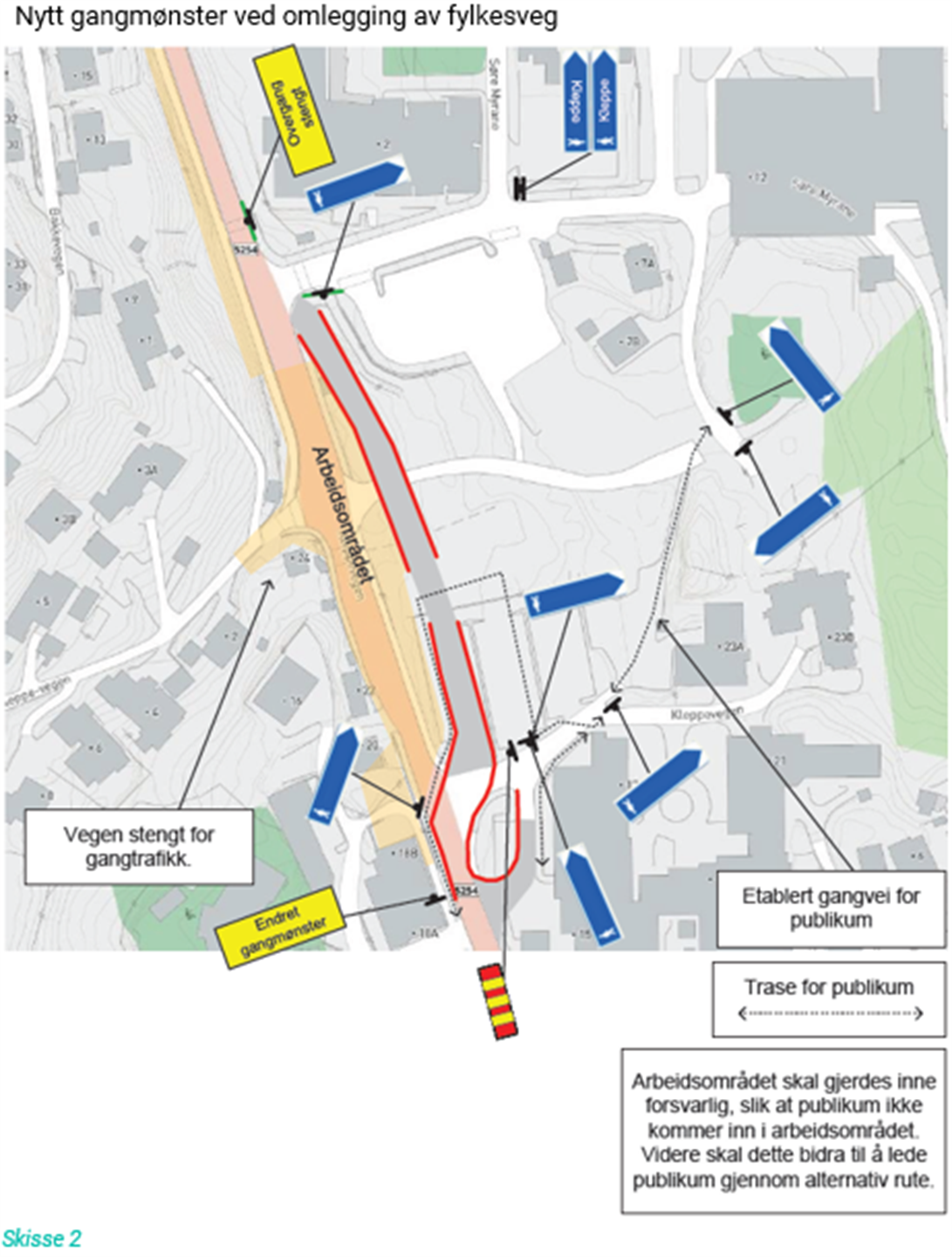 Stenging av gangfelt nord for Øvre Kleppe-vegen: Vi vil stengja av gangfeltet for å samla alle gåande på ein gangveg rundt anleggsområdet. Dette tiltaket vil betre tryggleiken for mjuke trafikantar under anleggsperioden.