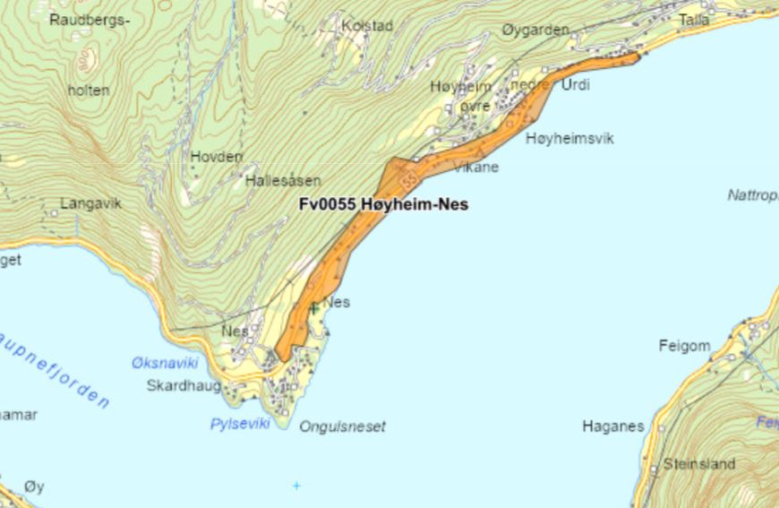 Strekninga fv. 55 Høyheimsvik-Nes ligg mellom tettstadane Høyheimsvik og Nes i Luster kommune. Utstrekninga er om lag 2400 meter. Vegen har variabel standard, men er tidvis spesielt smal og har dårleg kurvatur. Det er stadvis veldig dårleg sikt, busetnad heilt inn mot vegen og fleire avkøyrsler med uheldig utforming. Fleire vegmurar på strekninga er i ferd med å rase ut og vegen er dårleg fundamentert. Pga. nasjonale turistvegar er spesielt sommartrafikken er ei stor utfordring i dette området. Trafikken kan til tider stogge heilt opp på strekninga.